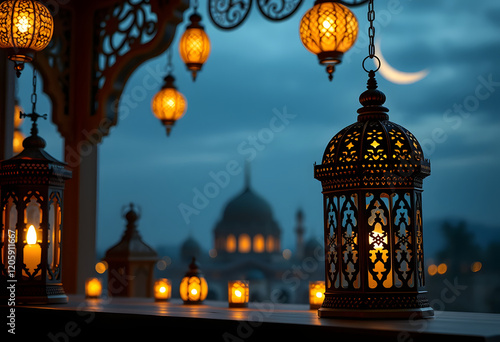 Obraz premium Glowing Ramadan Lanterns at Dusk Mosque View
