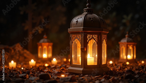 Fototapeta premium Glowing Ramadan lanterns illuminating soft candlelight at night, serenity