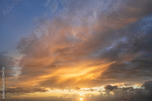 Naklejka premium Glowing real sky at sunset texture background overlay. Dramatic red and orange clouds.