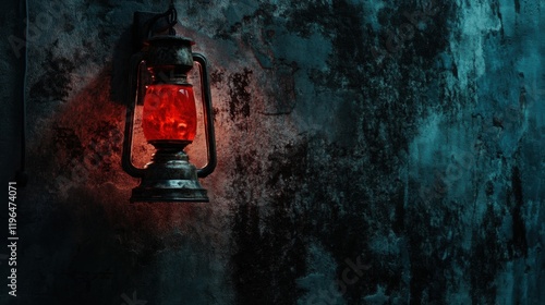 © Usman, Fototapeta premium Glowing Red Antique Lantern on Dark Textured Wall Halloween Mystery