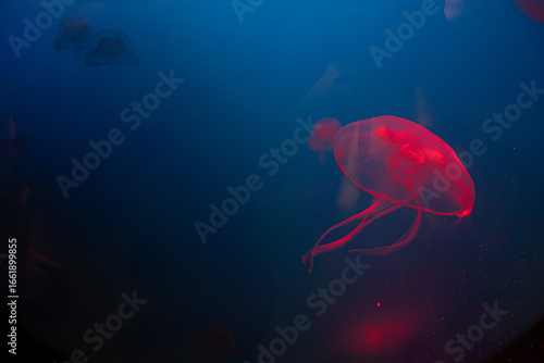 © ago, Naklejka premium Glowing red jellyfish swimming in blue-lit aquarium water.