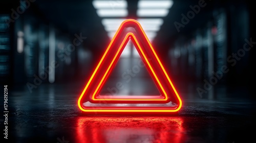 Fototapeta premium Glowing red triangular warning symbol illuminates a dark, futuristic hallway