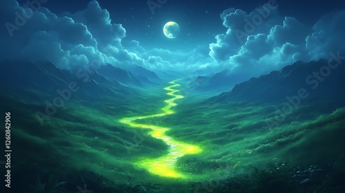 Fototapeta premium Glowing River Winds Through Moonlight Valley Mountains