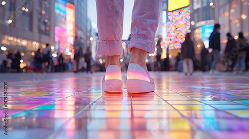 © Arjif, Fototapeta premium Glowing shoes on colorful reflective pavement in city