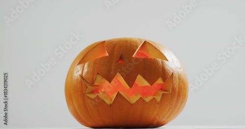 Fototapeta premium Glowing single carved pumpkin emitting warm candlelight on white platform...