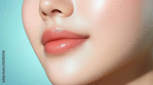 © Jenjira, Obraz premium Glowing skin with soft, natural lips on a fresh background. Anti-aging and injection concept.