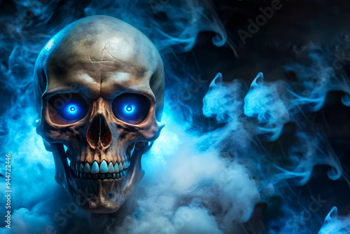 Fototapeta premium Glowing Skull In Blue Smoke - Halloween Concept