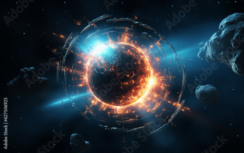Obraz premium Glowing spaceship orbits sphere in deep space