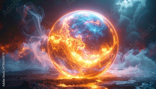 © Edan, Obraz premium Glowing sphere emits vivid orange & blue light against a moody, smoky backdrop