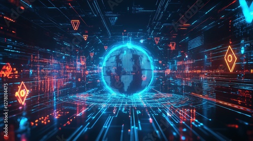 © nadimgdx, Obraz premium Glowing sphere with a digital grid-like structure in a virtual environment