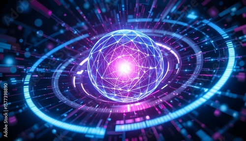 Obraz premium Glowing sphere with network connections surrounded by rings in a futuristic...