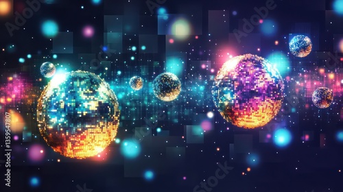 © Graphi Fusion, Obraz premium Glowing Spheres Emerging from a Pixelated Square abstract background