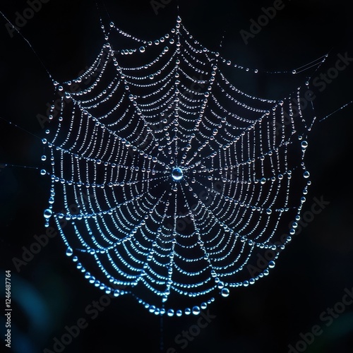 © Thares2020, Naklejka premium Glowing Spider Web Intricately Woven in Darkness with Dew Droplets Reflecting Faint Light
