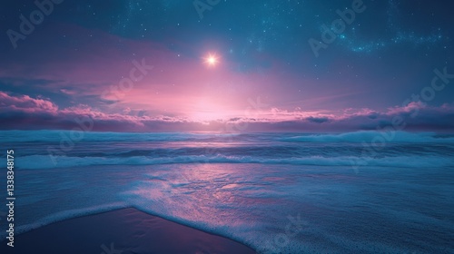 © Postproduction, Fototapeta premium Glowing star above a beach under a dark sky.