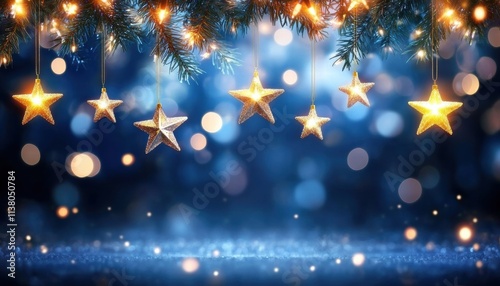 Naklejka premium Glowing stars hang from a festive Christmas tree, creating a magical ambiance...