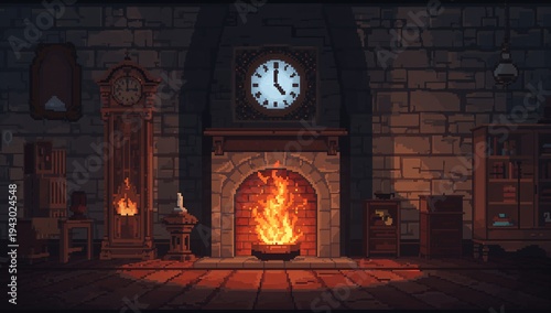 Obraz premium Glowing stone fireplace casting warm light in stone hearth room, with metal brazier and tall clock