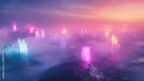 Obraz premium Glowing structures in a misty alien landscape at sunset; fantasy art