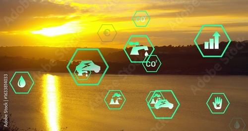 © vectorfusionart, Naklejka premium Glowing sun disc casting bright reflection on lake at sunset, with neon-green hex icons, copy space
