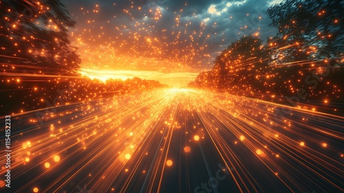 © siyons, Fototapeta premium Glowing Sunset Highway Speed Light Trails