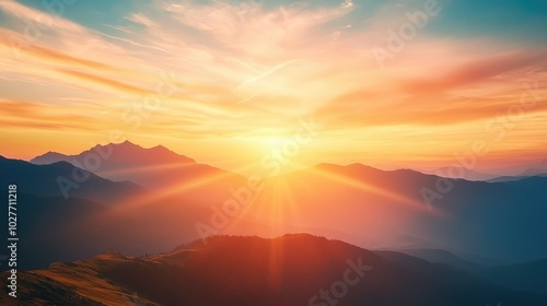 © Tuachan, Fototapeta premium Glowing Sunset Over Majestic Mountains