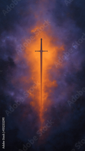 © AnyPic289, Naklejka premium Glowing sword silhouette surrounded by cosmic orange and blue mist