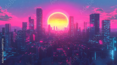 © Khukrit, Fototapeta premium Glowing Synthwave Sunset Over Retro Cityscape in Anime Aesthetic