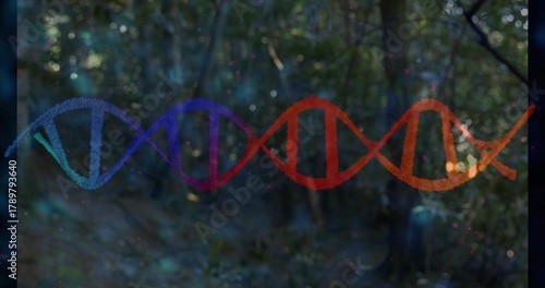 © vectorfusionart, Fototapeta premium Glowing translucent DNA double-helix ribbon spanning wooded clearing, scattering color speckles