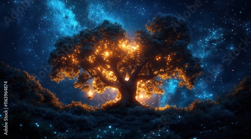 © mochalfin, Fototapeta premium Glowing tree at night under a starry sky.