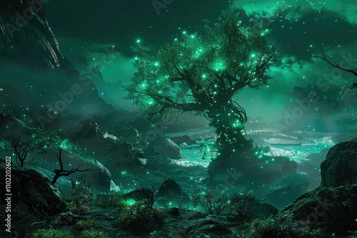 © boler, Obraz premium Glowing Tree in a Mystical, Foggy Forest Landscape