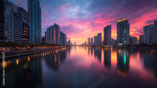 Naklejka premium Glowing up, A vibrant city skyline at dusk featuring glowing skyscrapers, perfect for urban-themed projects or promotional materials.