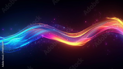 Obraz premium Glowing, vibrant wave of light with iridescent particles on a dark background.