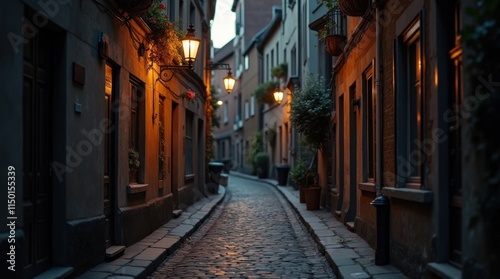 Fototapeta premium Glowing Vintage Street Lamp in a Quiet Cobblestone Alley at Dusk