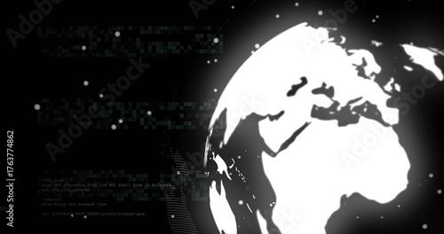 Fototapeta premium Glowing white digital globe spinning at right, with alphanumeric code and...