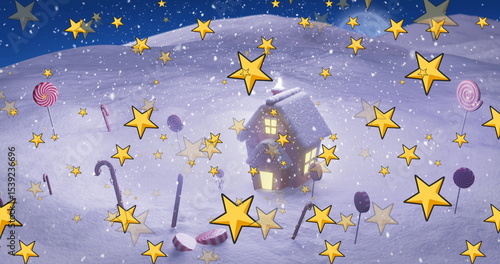 Fototapeta premium Glowing windows lighting gingerbread house sitting on snowy hill, with candy canes, floating stars