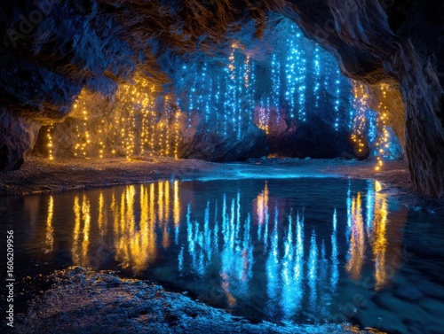 Obraz premium Glowing Yellow and Blue Lights Illuminating a Mysterious Cave with Shadows