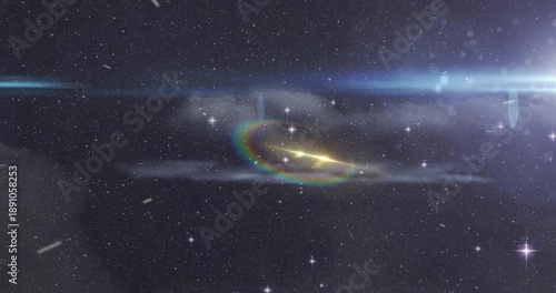 Fototapeta premium Glowing yellow-white core emitting rainbow arc across deep space, with lens...