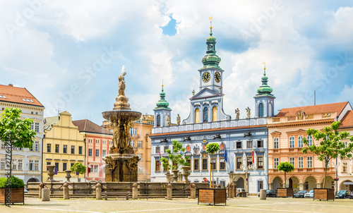 Naklejka premium Główny plac w Czeskich Budziejowicach z fontanną Samsona i budynkiem ratusza - Czechy