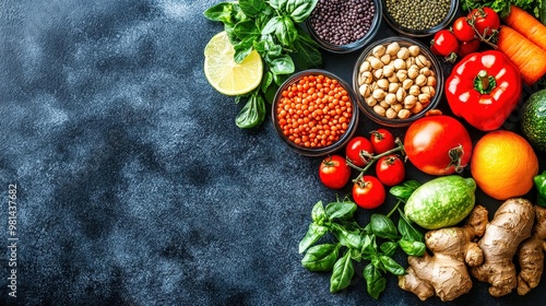 © Tetiana, Fototapeta premium Glucose meter surrounded by fresh fruits, vegetables, berries and supplements on black background