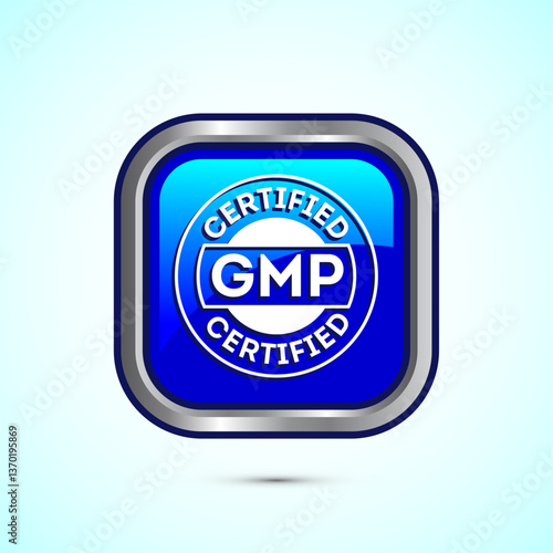 © BakiBullah, Fototapeta premium GMP certified icon design illustration. Good manufacturing practice label badge, Blue color square button design