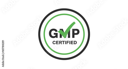 Fototapeta premium GMP Certified logo with a green checkmark inside a green and black circle, indicating good manufacturing practices compliance.