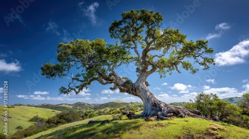 © Fiora, Obraz premium Gnarled Ancient Oak Tree Dominates Verdant Hilltop Under Expansive Blue Sky.