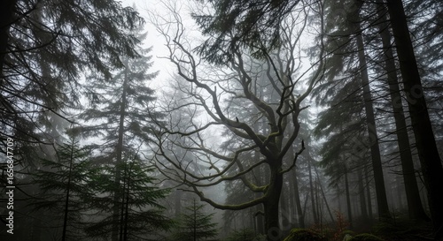 Fototapeta premium Gnarled Tree in Misty Forest nature