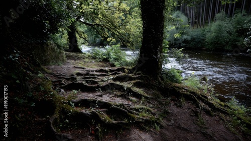 Fototapeta premium Gnarly ancient tree roots exposed on a riverbank path in a lush forest setting