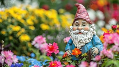 © Tati, Obraz premium Gnome statue in colorful garden surrounded by blooming flowers