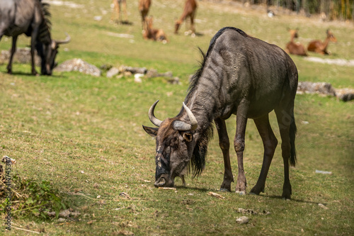 Naklejka premium gnu grazing grass in a zoo