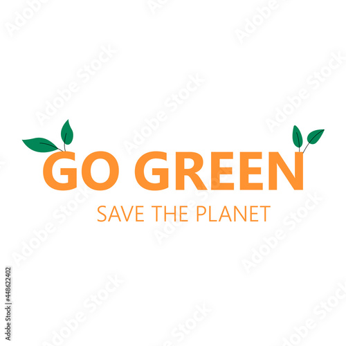 Fototapeta premium Go green typography banner with leaves. Save the planet concept. Environmental protection. Vector flat illustration on isolated white background. Eps 10