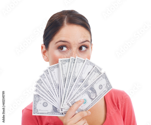 Fototapeta premium Goal, winner and finance with woman and money for investment, success and growth. Cash, dollar and wow with face of girl customer isolated on white background for financial, deal and promotion