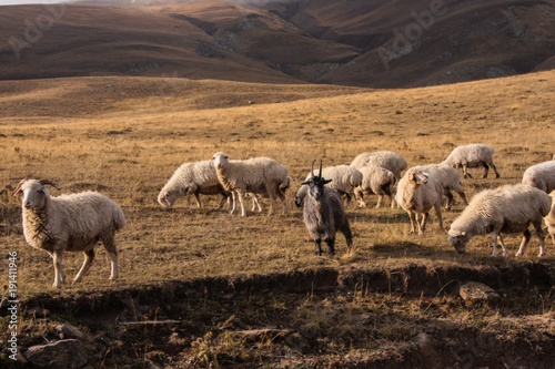 © homopaparaccis, Obraz premium goat and sheeps herd under low cloud