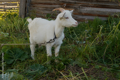 Fototapeta premium Goat eating grass,Goat on a pasture. White goat. Cattle on a village farm.