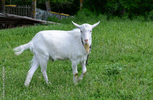 © TATIANA, Obraz premium Goat grazes in a meadow close to home